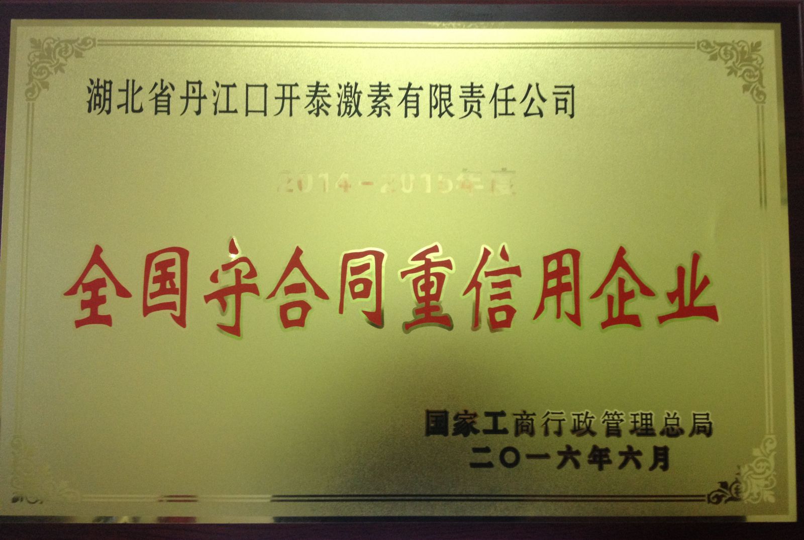 2016年11月7日,市工商局局長(zhǎng)陳傳兵一行為開(kāi)泰公司送來(lái)“全國(guó)守合同重信用企業(yè)”的獎(jiǎng)牌。這是我公司繼獲得湖北省“守合同重信用企業(yè)”榮譽(yù)后,首次獲此殊譽(yù),十堰市僅有兩家企業(yè)榜上有名。