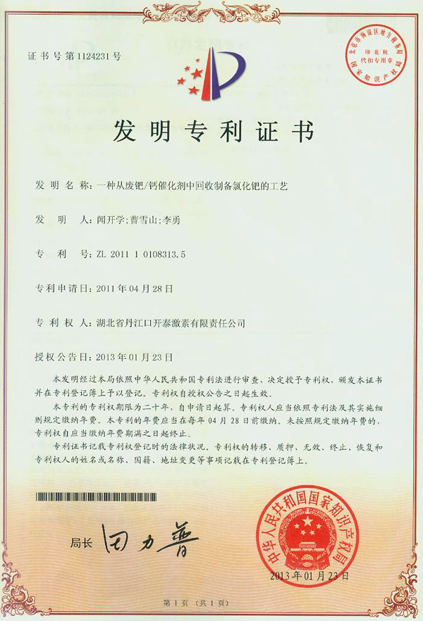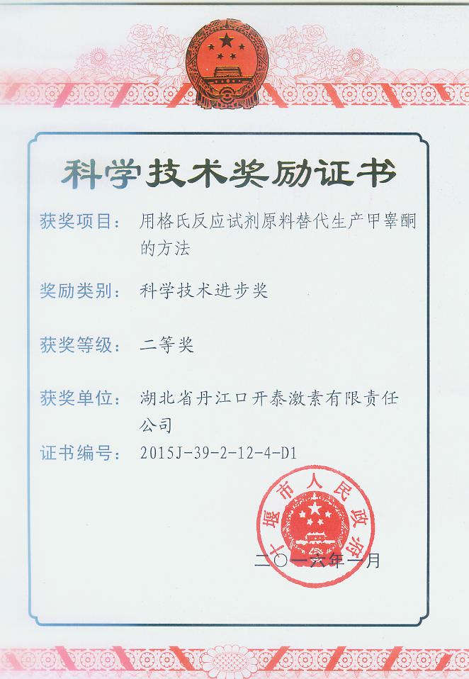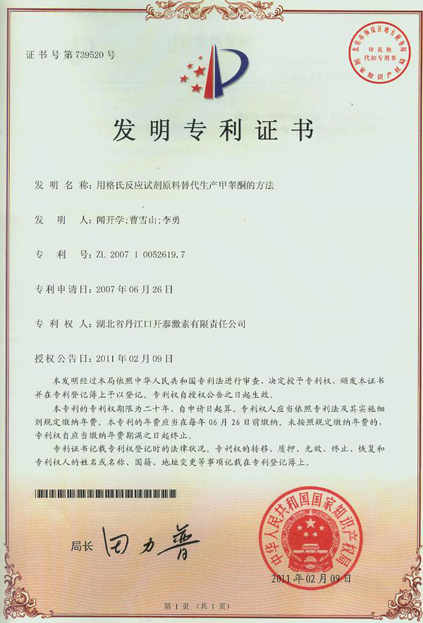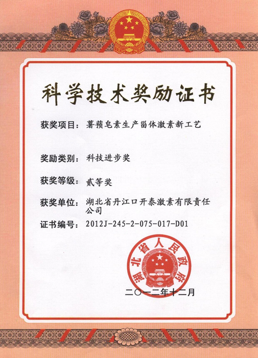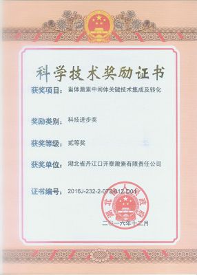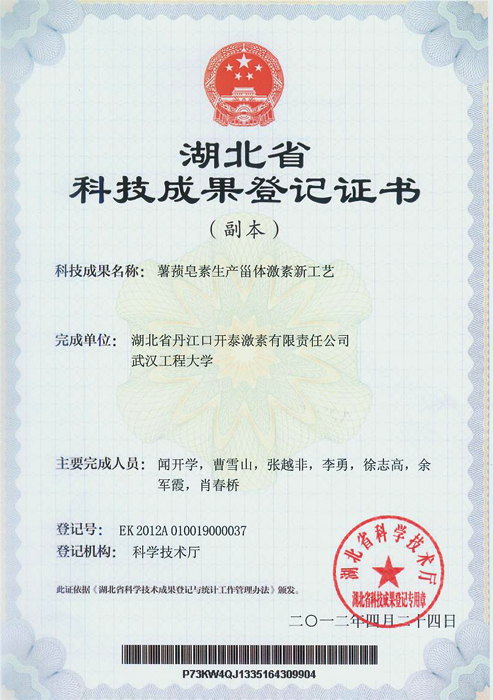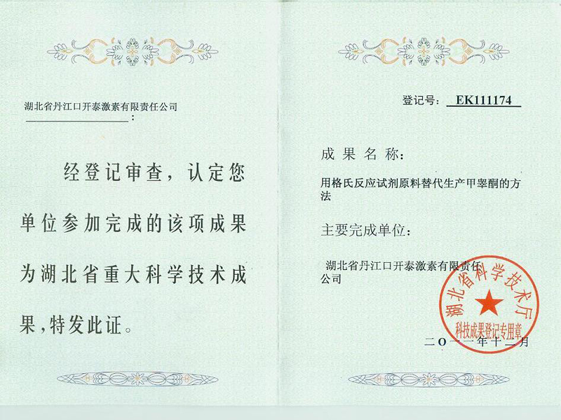 We have committed and implemented 22 national, provincial and municipal major science and technology projects in past three years, including 2 projects of National Innovation Fund, 3 projects of Major scientific and technological achievement in Hubei province, 3 national invention patents and 5 applied patents; Up to now, we have obtained 18 projects innovation achievements and achievement-transferring projects, and developed 10 "two high-one-priority" new products; especially, our dehydroepiandrosterone and other four products have been put into mass production. The key technology of our three kinds of steroid hormone intermediates products such as 16,17-a-Epoxyprogesterone, dehydroepiandrosterone and methyltestosterone has passed the technical authentication held by Hubei Province Science and Technology Bureau, and all members of expert group agreed that the key technology of these three products has reached the international advanced level, Now, this technology has been registered as the "Major scientific and technological achievement in Hubei province", and obtained "second prize of scientific and technological progress in Hubei province" in 2012.